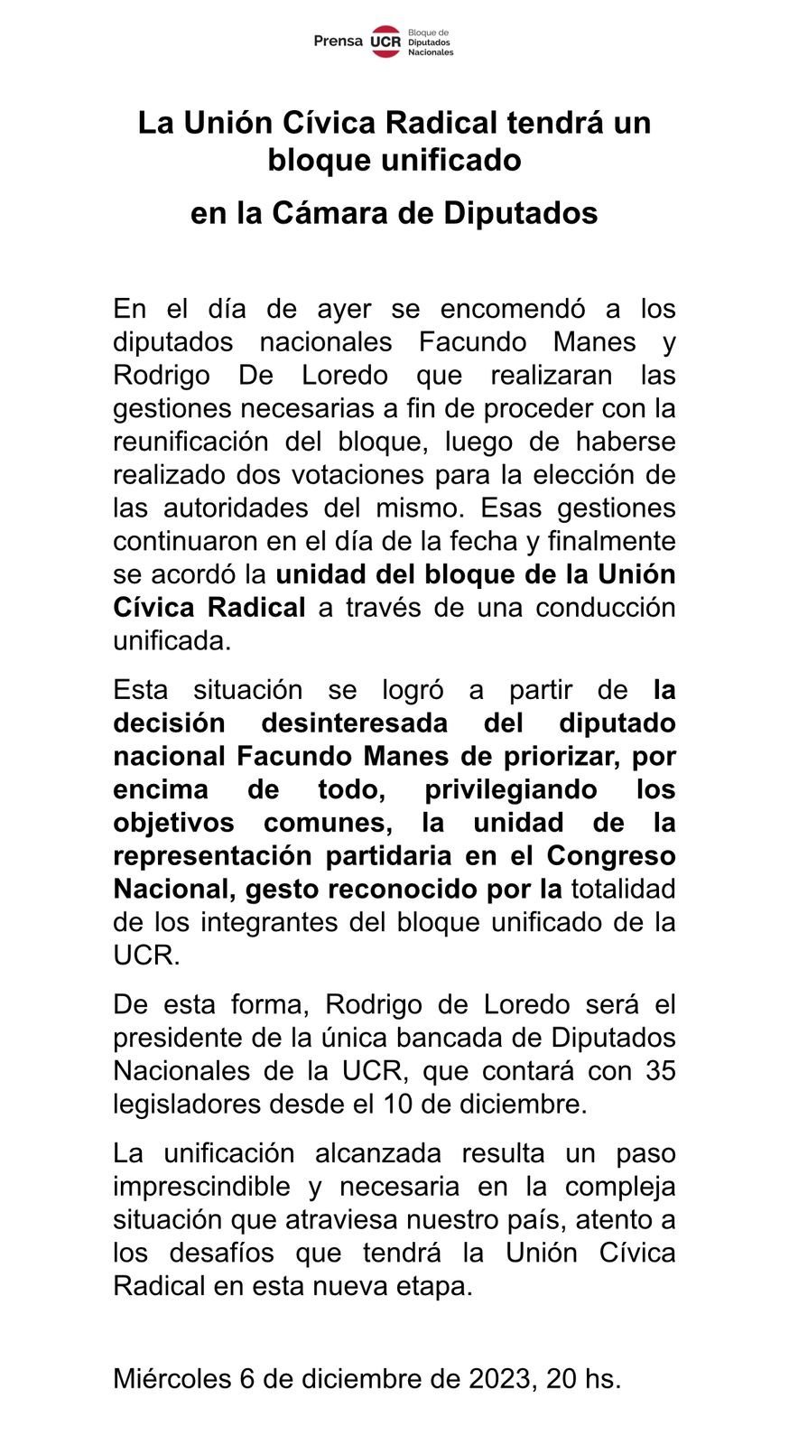 “En el día de ayer se encomendó a los diputados nacionales Facundo Manes y Rodrigo De Loredo que realizaran las gestiones necesarias a fin de proceder con la reunificación del bloque, luego de haberse realizado dos votaciones para la elección de las autoridades del mismo. Esas gestiones continuaron en el día de la fecha y finalmente se acordó la unidad del bloque de la Unión Cívica Radical a través de una conducción unificada”, confirmaron en un comunicado.