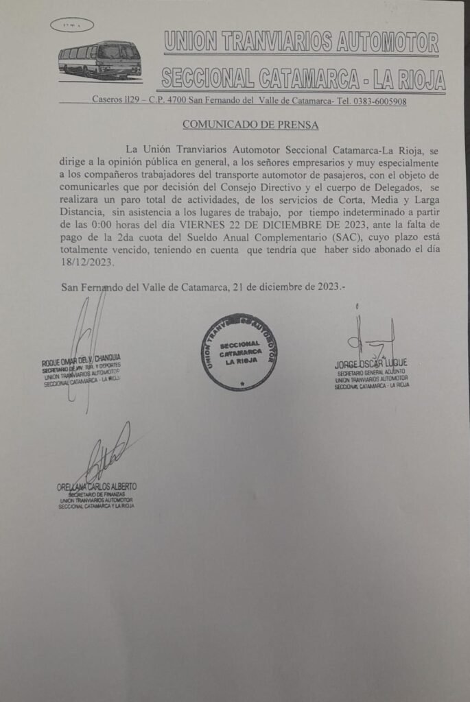 La Unión Tranviarios Automotor (UTA) seccional Catamarca-La Rioja anunció a través de un comunicado oficial que llevará a cabo un paro total de actividades en los servicios de transporte público de corta, media y larga distancia el próximo viernes 22 de diciembre.