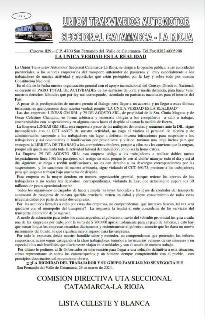 En medio del paro de transporte de corta y media distancia, la Unión Tranviarios Automotor Seccional Catamarca-La Rioja (UTA), denunció a través de un comunicado que las empresas obligaron a los empleados a romper con la medida y salir a trabajar.