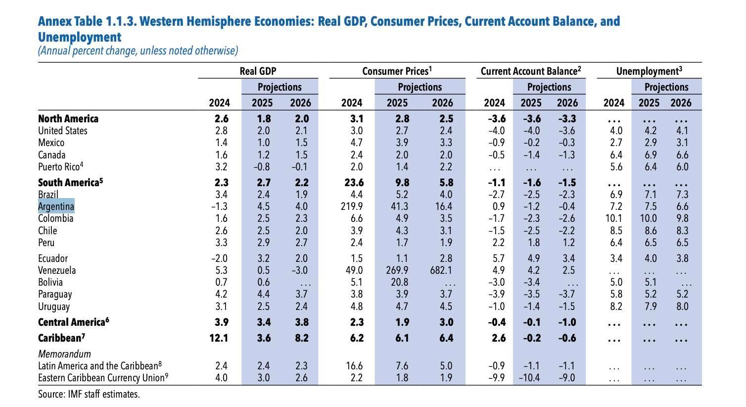En la previa a la bilateral entre Donald Trump y Javier Milei, el Fondo Monetario Internacional (FMI) empeoró sus previsiones para la Argentina. El organismo multilateral pronosticó un menor crecimiento para este año, con una mejora de la actividad acotada al 4,5% y una mayor inflación, con una variación anual del 41,3%.